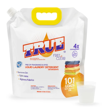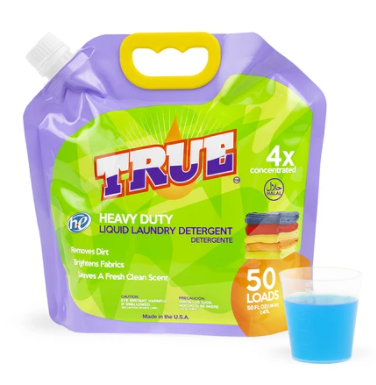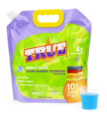 For High Efficiency and Top Load Washers- Use 1/8 cup. To pre-treat, apply before cycle begins. True can be used on all washable natural and synthetic fabrics, and woks in all temperatures.
